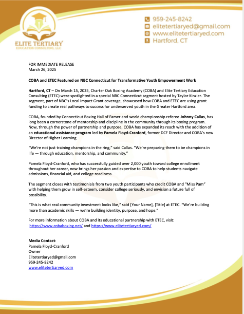 On March 15, 2025, NBC Connecticut aired a heartwarming and powerful segment that put a spotlight on the inspiring work being done by Charter Oak Boxing Academy (COBA) and Elite Tertiary Education Consulting (ETEC). Through the lens of the Local Impact Grant, this story is a testament to what happens when passion meets purpose — and how local heroes are building up the next generation.